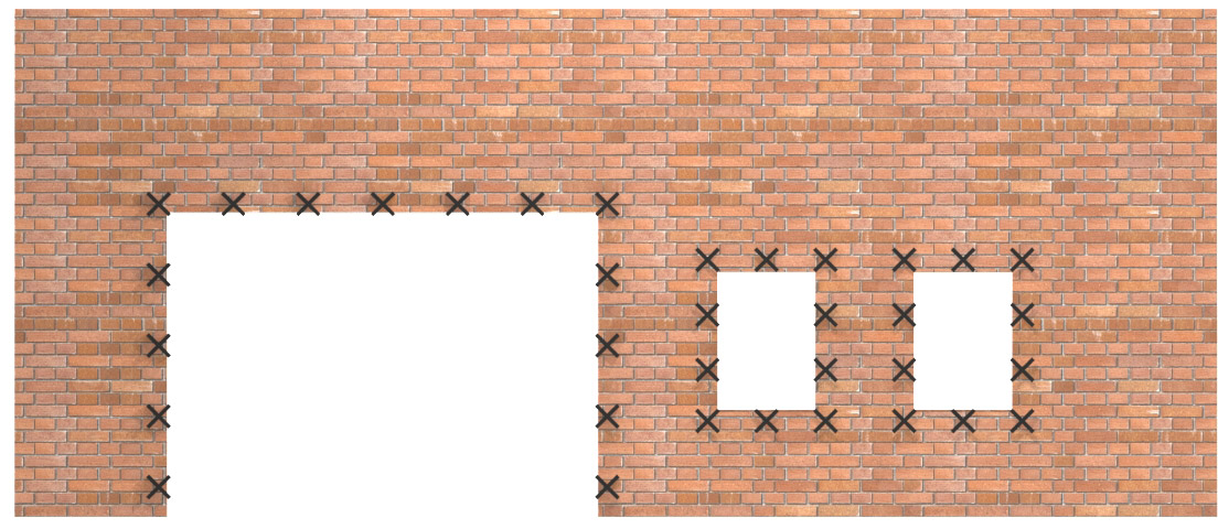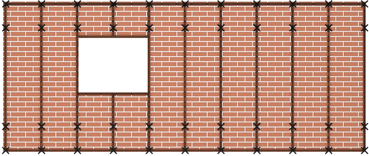 Vid ihopmurade och/eller armerade hörn ska inte kramlor placeras närmare vägghörn än 1.0 m enligt EKS 11, avd. H, detta för att inte inverka ogynnsamt på murverkets förmåga att klara temperatur- och fuktrörelser på den anslutande väggsidan. Antalet kramlor ökas med 50 % på strimlan närmast det kramlingsfria hörnet. Se figur 3.2.4.