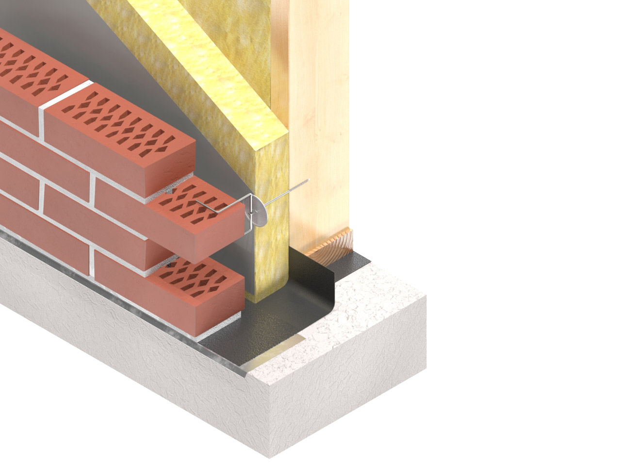 Kramlor bör förses med isoleringsbricka som dels håller isoleringen på plats och samtidigt hindrar vatten från regngenomslag att tränga in i isoleringen via kramlorna. Vidare ska kramlor ej monteras med fall mot stommen. Se figur 3.2.3. Kramling påbörjas i andra skiftet efter anläggningsskiftet. I första skiftet bör fogarmering av bistål läggas in och under anläggningsskiftet bör det läggas ett glidskikt för att dels förhindra risken för uppsprickning i skalmuren, dels ge möjlighet att förlänga avståndet till närmaste dilatationsfog. Se figur 3.2.3.